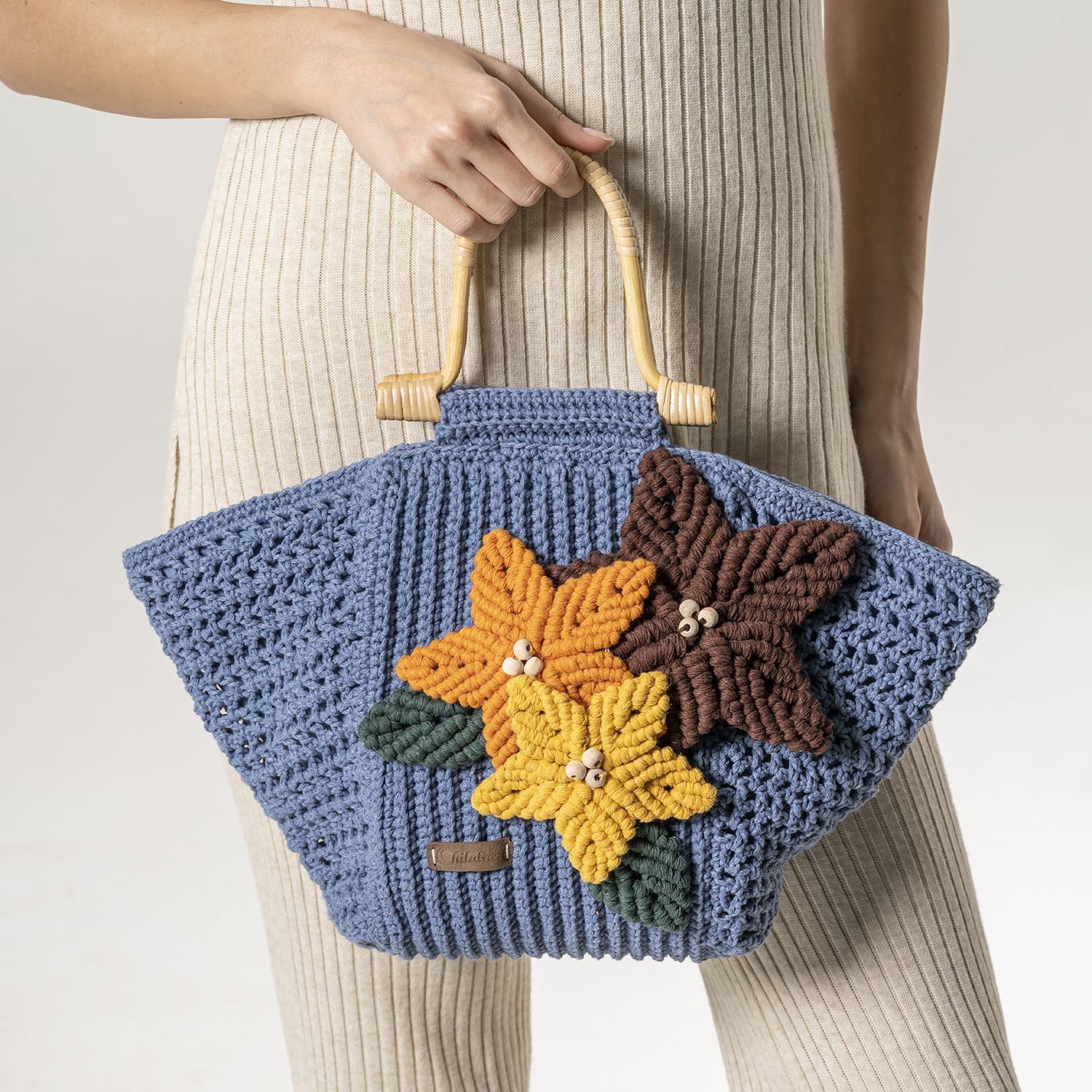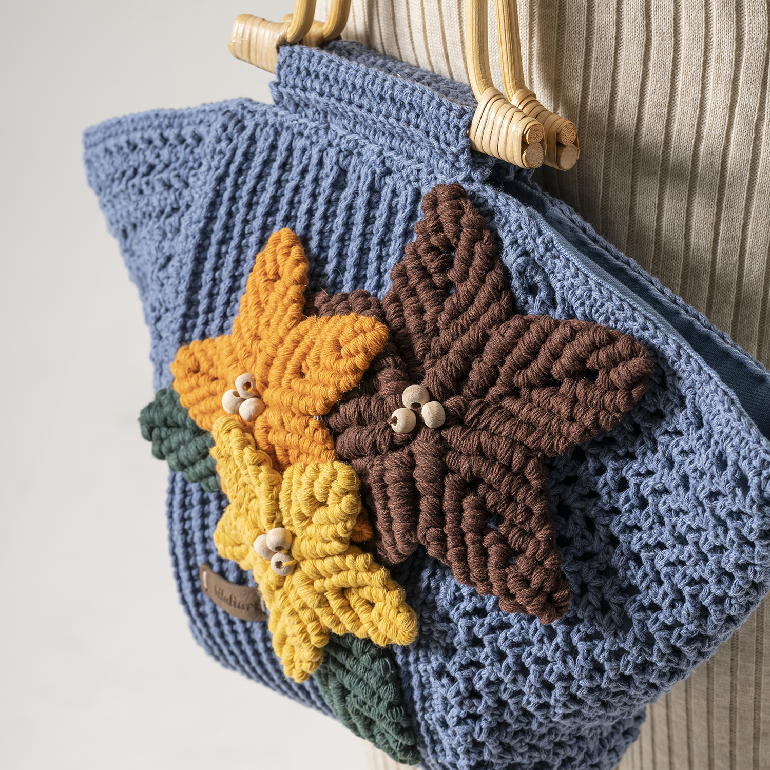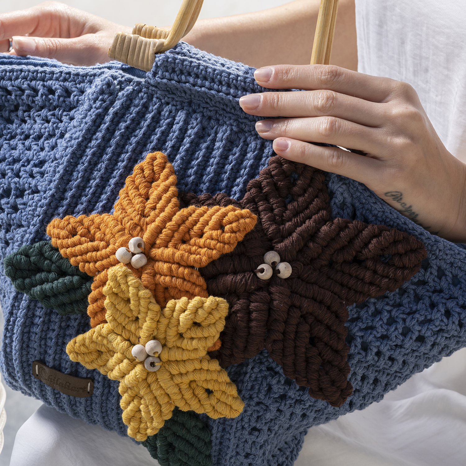 Our aim is to inspire your style with our hand-made bags. They are crocheted using cotton yarns, just for you. With their bamboo handles and recycled jean-material inner lining, our goal was to add an environmentally friendly touch! They were designed for summer and made with love.